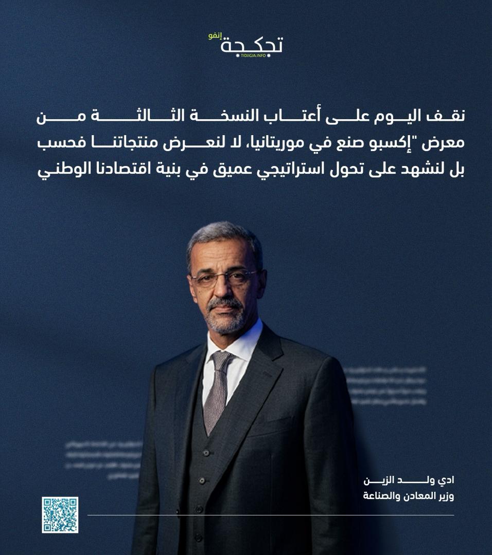 قال وزير المعادن والصناعة، ادي ولد الزين، إن النسخة الثالثة من معرض "إكسبو صنع في موريتانيا" لا تمثل فرصة لعرض المنتجات الوطنية فحسب، بل تعد شاهدا على تحول استراتيجي عميق في بنية الاقتصاد الوطني.