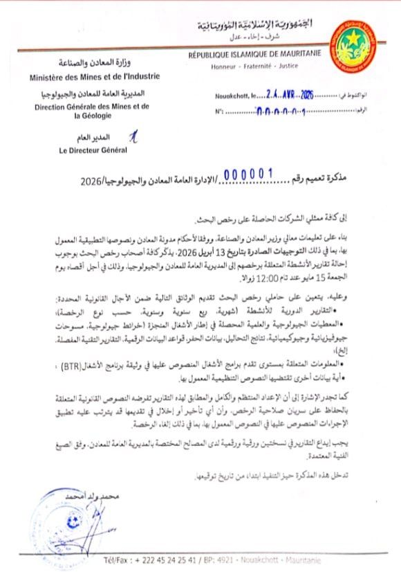 وأشارت الوزارة إلى أن تلك التقارير تشمل مختلف الوثائق الفنية والعلمية، من بينها التقارير الدورية (الشهرية، الربع سنوية، والسنوية حسب نوع الرخصة)، والمعطيات الجيولوجية المتحصل عليها، كالخرائط ونتائج المسوحات والتحاليل، إضافة إلى قواعد البيانات الرقمية والتقارير الفنية المفصلة، فضلاً عن المعطيات المتعلقة بمستوى تقدم الأشغال مقارنة ببرنامج الأشغال المعتمد (BTR).
