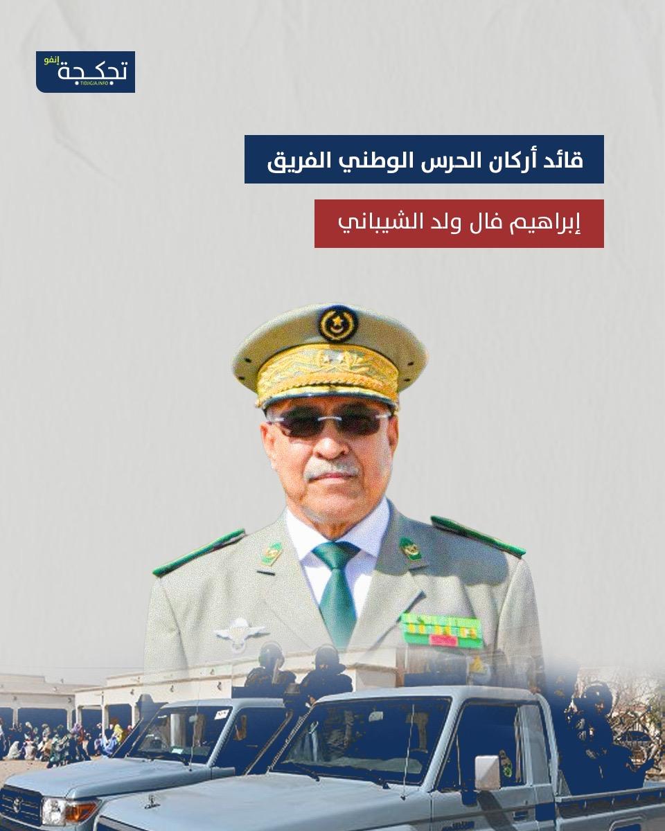 تولى الفريق إبراهيم فال ولد الشيباني منصب قائد أركان الحرس الوطني بعد خبرة طويلة في الأجهزة العسكرية والأمنية، شملت قيادة الأركان الخاصة للرئيس وإدارة الأمن الخارجي والتوثيق.