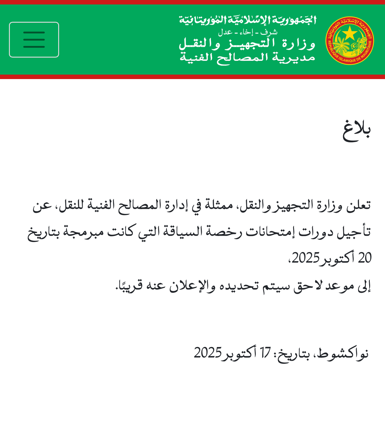 أعلنت وزارة التجهيز والنقل، ممثلة في إدارة المصالح الفنية للنقل، عن تأجيل دورات امتحانات رخصة السياقة التي كانت مبرمجة بتاريخ 20 أكتوبر 2025، إلى موعد لاحق سيتم تحديده والإعلان عنه قريبًا.
