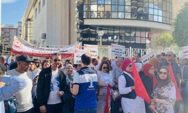 وقد تجمع مئات من موظفي البنوك وشركات التأمين أمام المقر المركزي لاتحاد الشغل بالعاصمة تونس، رافعين لافتات تطالب بزيادة أجورهم.