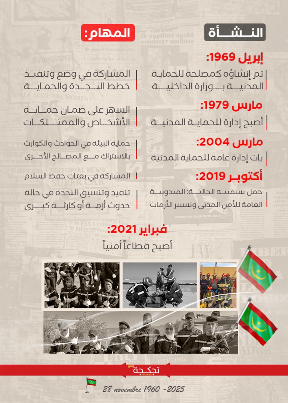 يشكل قطاع الأمن المدني أحد أهم المؤسسات المعنية بحماية المواطنين، وقد مرّ بمحطات أساسية منذ تأسيسه سنة 1969، قبل أن يتحول إلى إدارة ثم إدارة عامة، ليحمل في 2019 تسمية المندوبية العامة للأمن المدني وتسيير الأزمات، ويصبح قطاعًا أمنيًا متكاملًا سنة 2021.