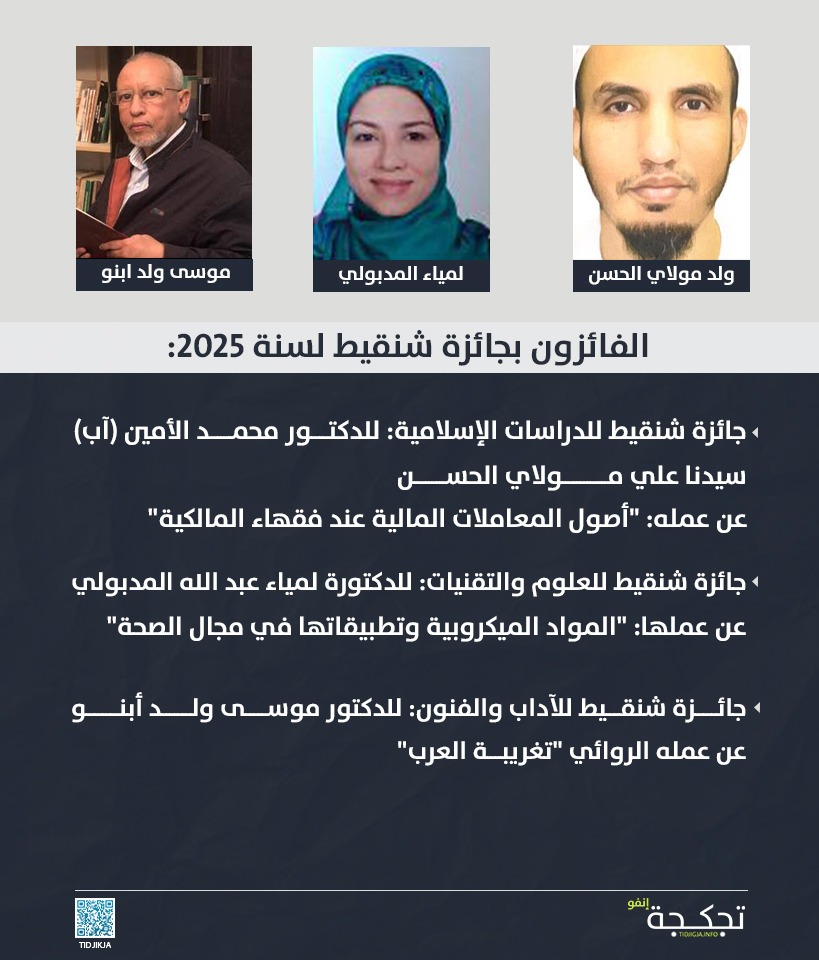 – جائزة شنقيط للدراسات الإسلامية: للدكتور محمد الأمين (آب) سيدنا علي مولاي الحسن، عن عمله: "أصول المعاملات المالية عند فقهاء المالكية".