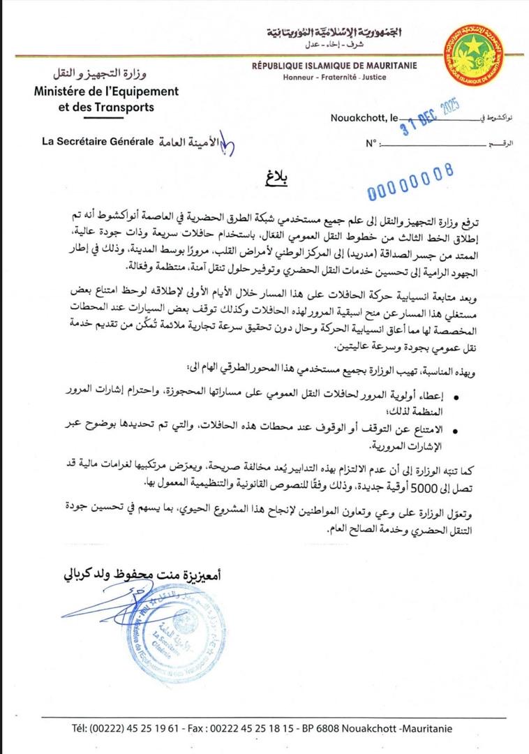 ودعت الوزارة جميع مستخدمي هذا المحور الطرقي إلى احترام أولوية المرور لحافلات النقل العمومي والامتناع عن الوقوف أو التوقف عند محطاتها المحددة بإشارات واضحة، محذرة من أن مخالفة هذه الإجراءات تُعد مخالفة صريحة يعاقب عليها بغرامات قد تصل إلى 5000 أوقية جديدة وفقًا للنصوص المعمول بها.