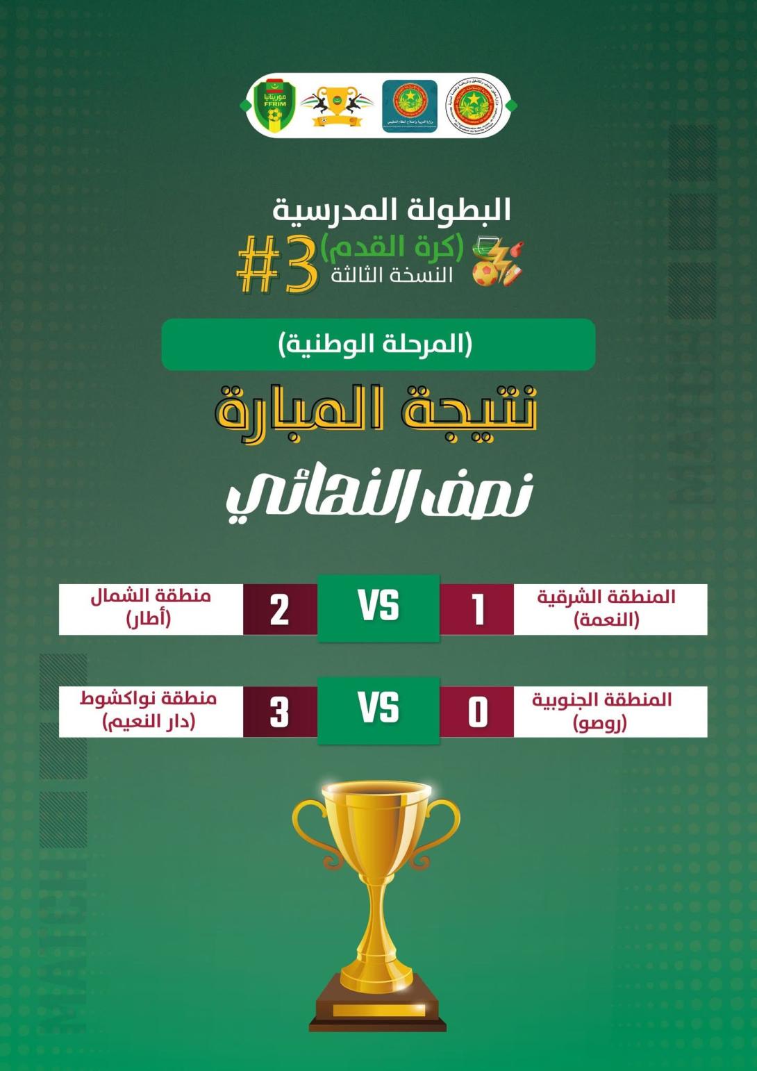 وبهذا التأهل، يضرب تلاميذ مدارس آدرار موعدًا في المباراة النهائية مع تلاميذ مدارس نواكشوط الشمالية، ممثلي منطقة نواكشوط، الذين ضمنوا بطاقة العبور إلى النهائي بعد فوزهم على تلاميذ مدارس ولاية اترارزة ممثلي المنطقة الجنوبية بنتيجة ثلاثة أهداف مقابل صفر (3-0).