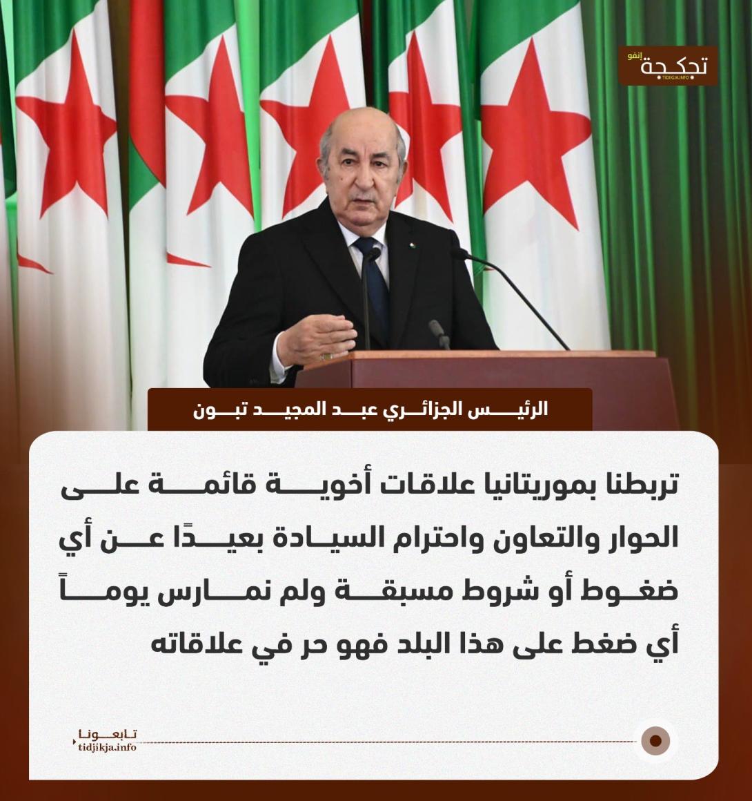 أكد الرئيس الجزائري عبد المجيد تبون أن موريتانيا بلد شقيق، مشددًا على أن العلاقات بين الجزائر وموريتانيا قائمة على الأخوة والحوار والتعاون، بعيدًا عن أي ضغوط أو شروط مسبقة.