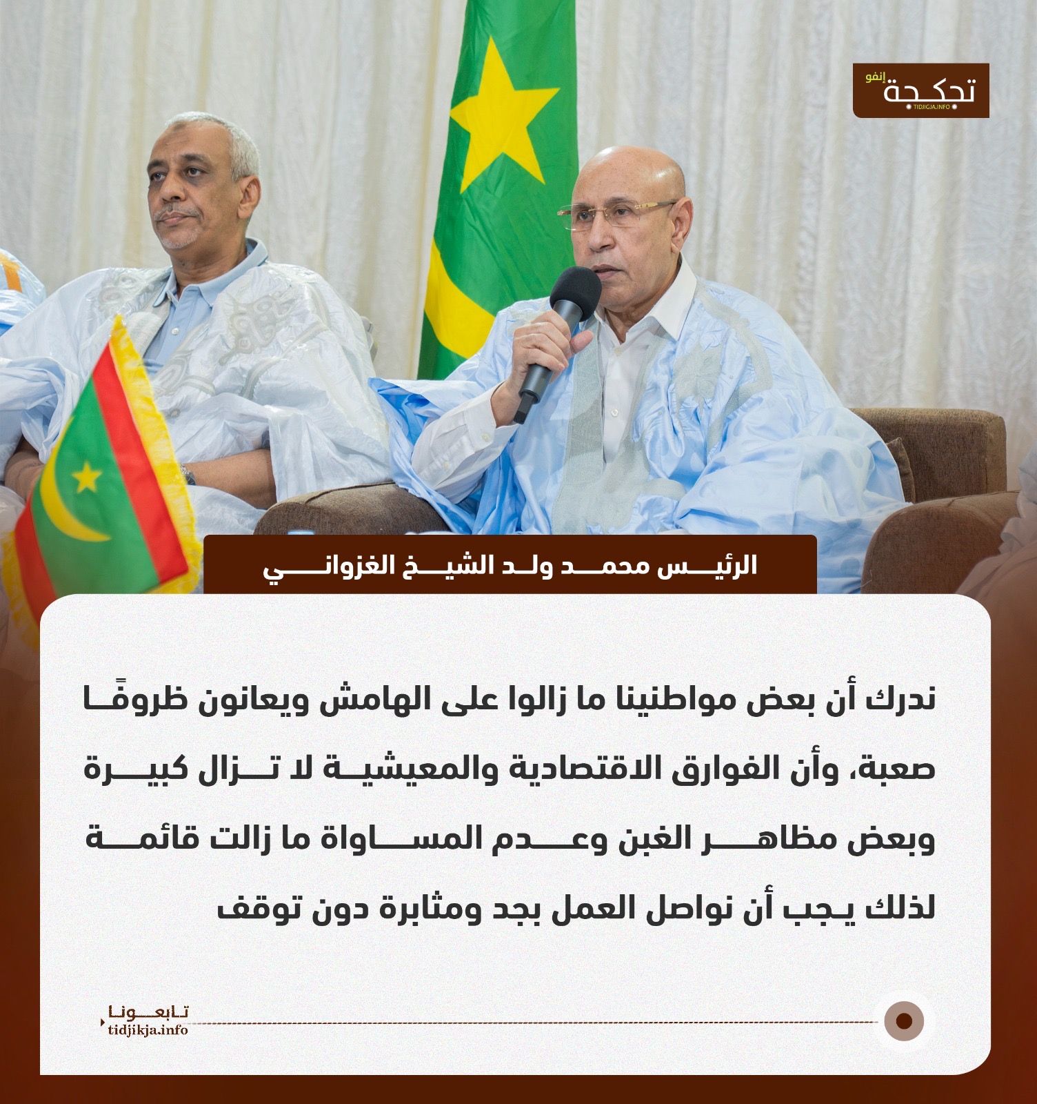 وأكد الرئيس غزواني أن الفوارق الاقتصادية والمعيشية لا تزال كبيرة وبعض مظاهر الغبن وعدم المساواة ما زالت قائمة لذلك يجب أن نواصل العمل بجد ومثابرة دون توقف.