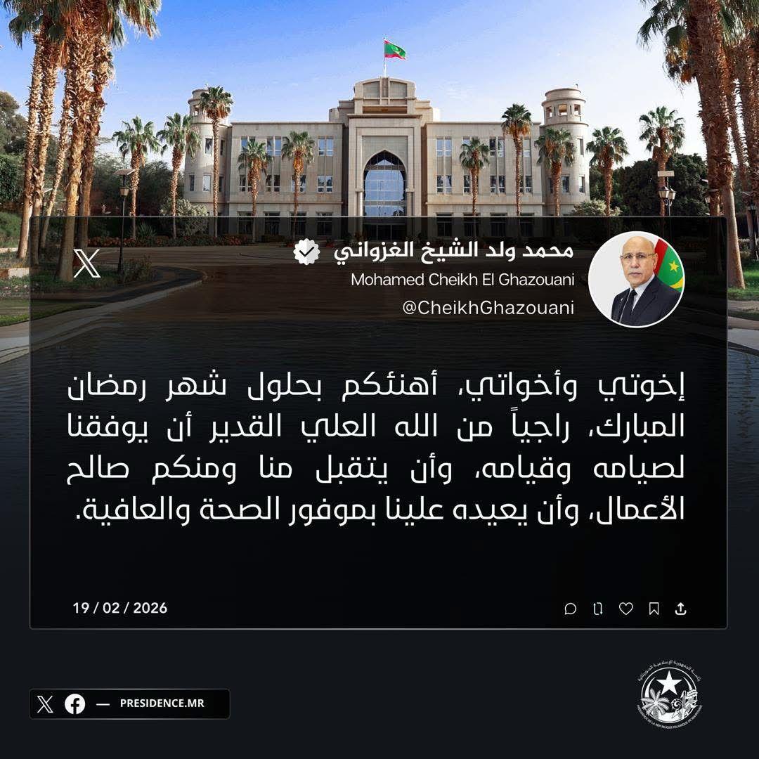 هنأ رئيسِ الجمهورية محمد ولد الشيخ الغزواني، المواطنين والمقيمين بحلول شهر رمضان المبارك، وذلك عبر حسابه الرسمي على منصة "إكس".
