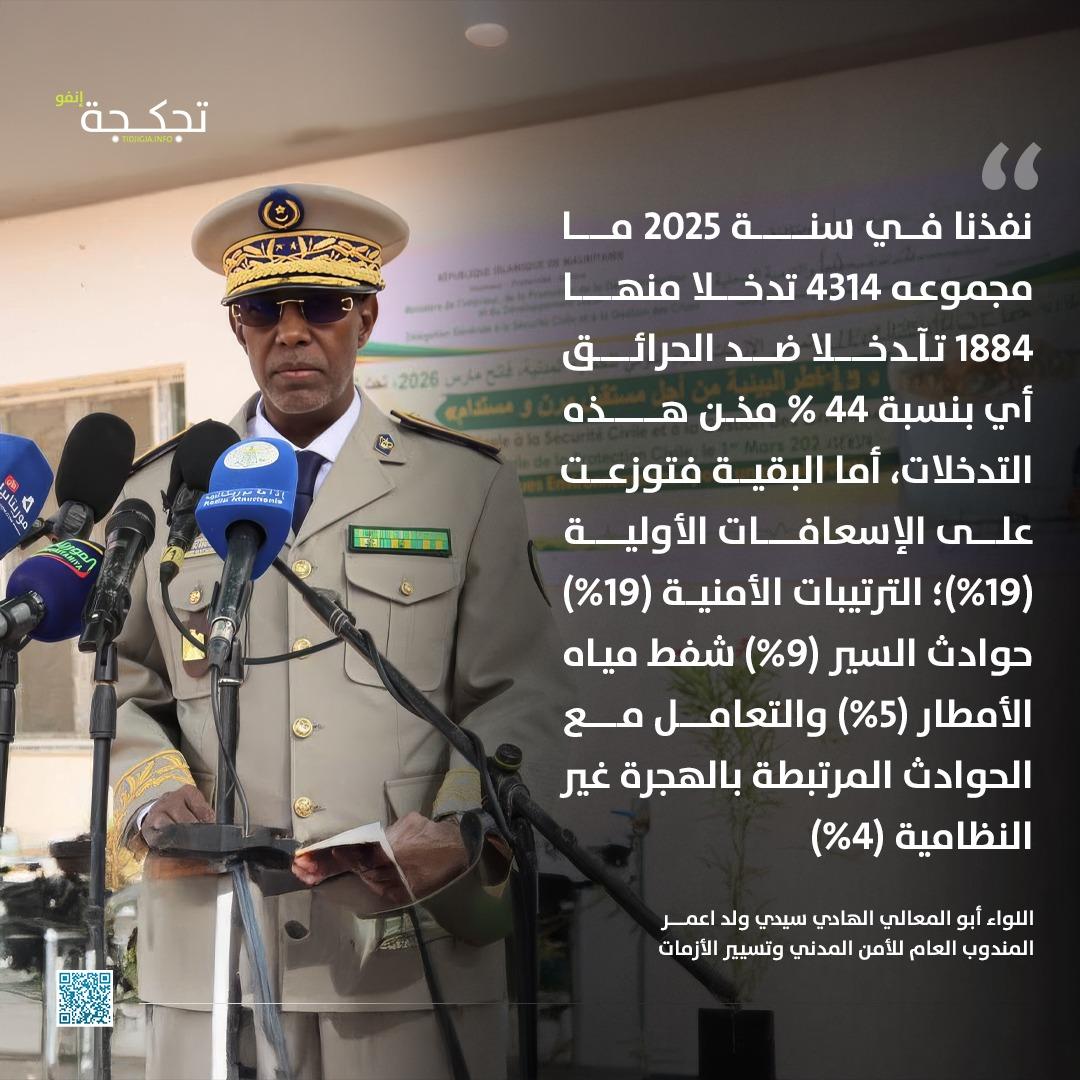أكد اللواء أبو المعالي الهادي سيدي ولد اعمر، المندوب العام للأمن المدني وتسيير الأزمات أن المدوبيية نفذت في سنة 2025 ما مجموعه 4314 تدخلا منها 1884 تدخلا ضد الحرائق أي بنسبة 44 % من هذه التدخلات، أما البقية فتوزعت على الإسعافات الأولية (19%)؛ الترتيبات الأمنية (19%)، حوادث السير (9%)؛ شفط مياه الأمطار (5%)؛ والتعامل مع الحوادث المرتبطة بالهجرة غير النظامية (4%)".