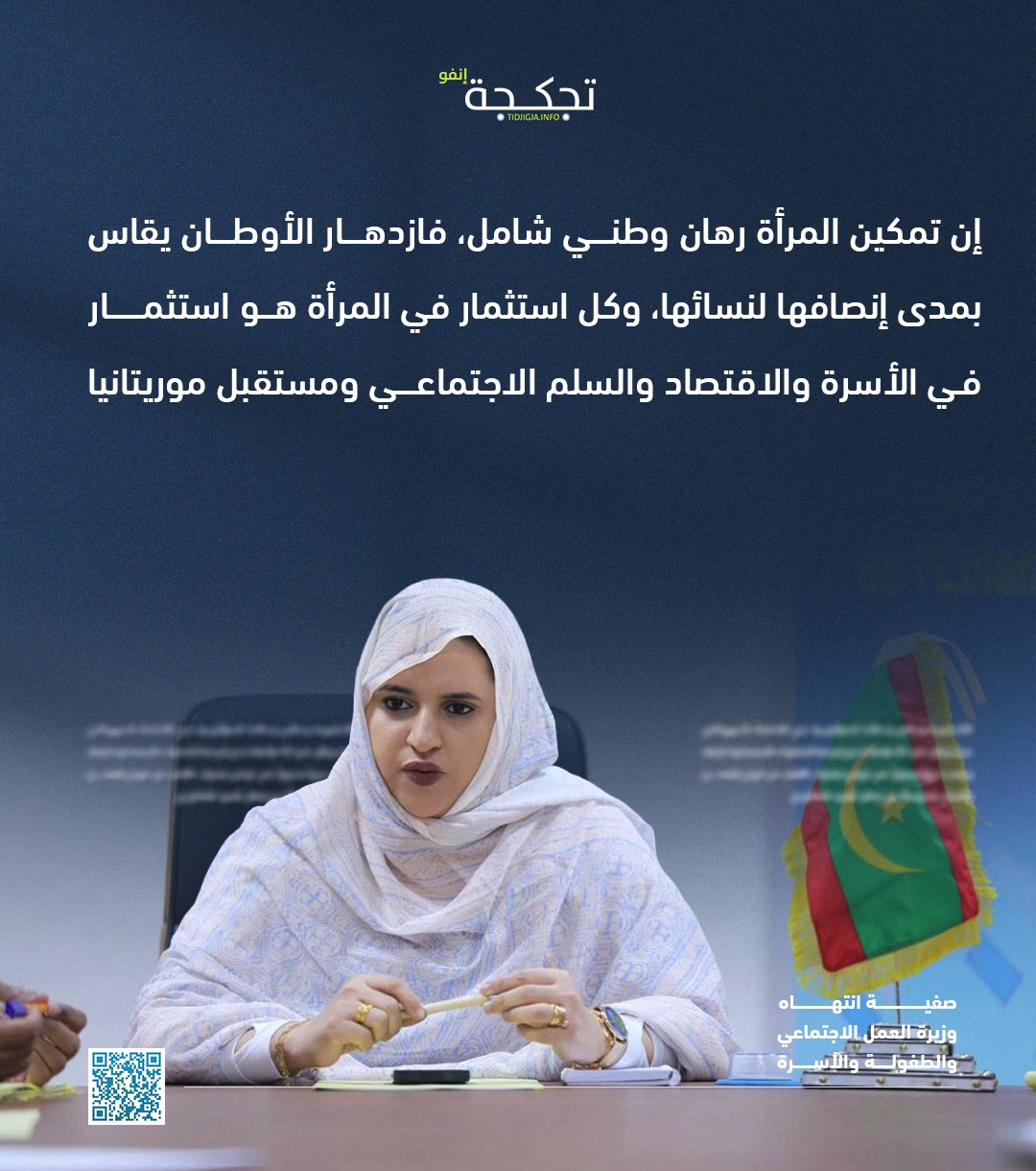 وأضافت الوزيرة:"وكل استثمار في المرأة هو استثمار في الأسرة والاقتصاد والسلم الاجتماعي ومستقبل موريتانيا."