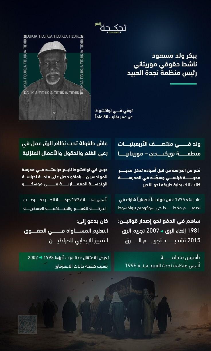 Mar 12 / التعليقات ببكر ولد مسعود.. حقوقي كرّس حياته للدفاع عن حقوق الإنسان ومحاربة الرق أُعلن في العاصمة نواكشوط عن وفاة الناشط الحقوقي الموريتاني ببكر ولد مسعود، رئيس ومؤسس منظمة نجدة العبيد، عن عمر ناهز ثمانين عاما.ويُعد ولد مسعود من أبرز الوجوه الحقوقية في موريتانيا، حيث خاض مسيرة طويلة في الدفاع عن حقوق الإنسان ومحاربة الرق. خميس, 2026/03/12 - 18:30