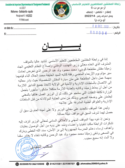 تكفلت وزارة التهذيب الوطني وإصلاح النظام التعليمي بعلاج مفتش مقاطعة كوبني محمد محمود ولد عبد الرحمن وكاتبه، بعد تعرضهما لحادث سير يوم الأربعاء الماضي.
