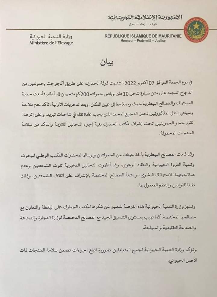 أعلنت وزارة التنمية الحيوانية مصادرة حمولة سيارتين من الدجاج المجمد، مؤكدة أن التحاليل المخبرية أكدت تلوث الشحنتين وعدم صلاحيتهما للاستهلاك البشري.