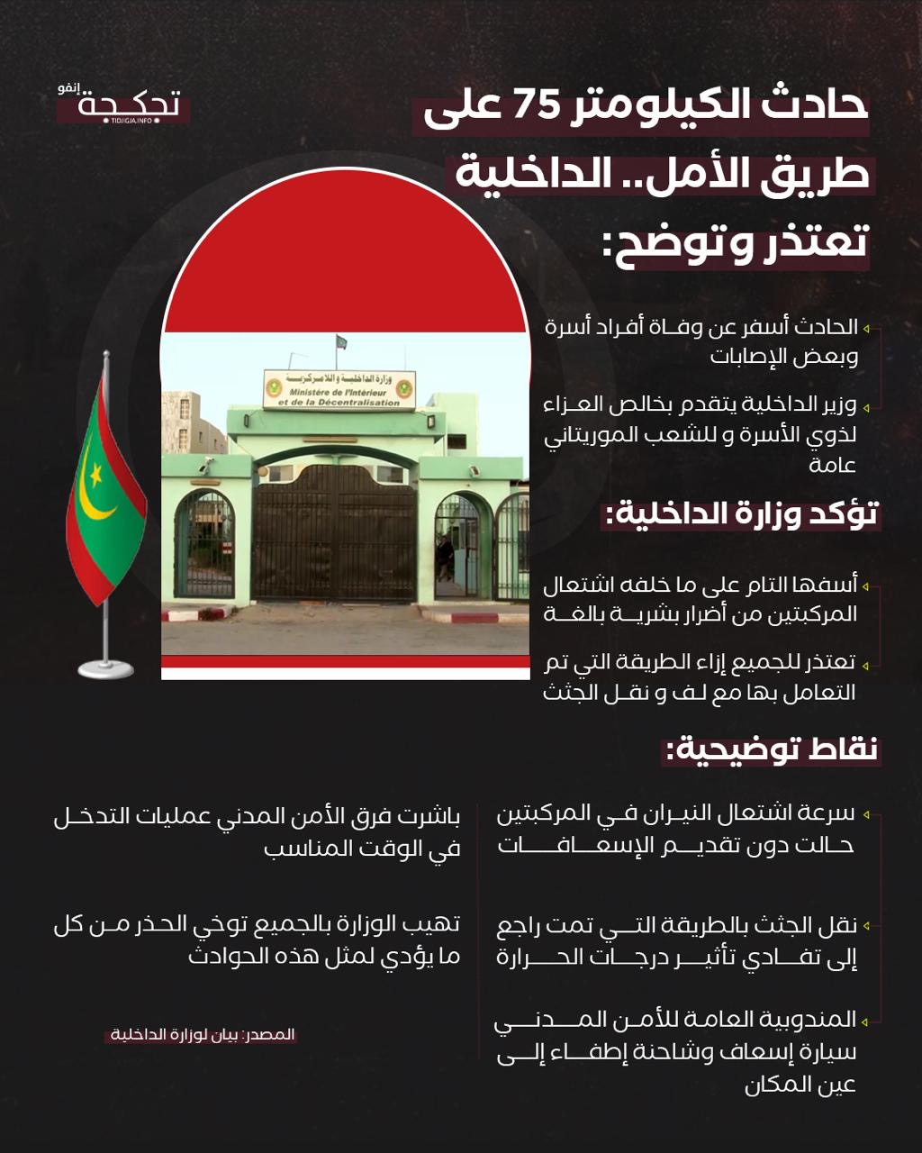 أعربت وزارة الداخلية، اليوم الأحد، عن "أسفها العميق واعتذارها للمواطنين" بخصوص الطريقة التي تم بها لفّ ونقل جثامين ضحايا حادث السير الذي وقع صباح اليوم عند الكيلومتر 75 شرق العاصمة نواكشوط.