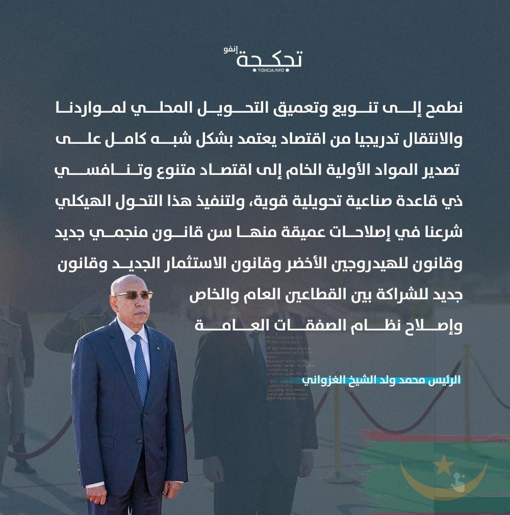 قال الرئيس محمد ولد الشيخ الغزواني إن موريتانيا تطمح إلى تنويع وتعميق التحويل المحلي لمواردها، والانتقال تدريجيا من اقتصاد يعتمد بشكل شبه كامل على تصدير المواد الخام إلى اقتصاد متنوع وتنافسي بقاعدة صناعية تحويلية قوية.