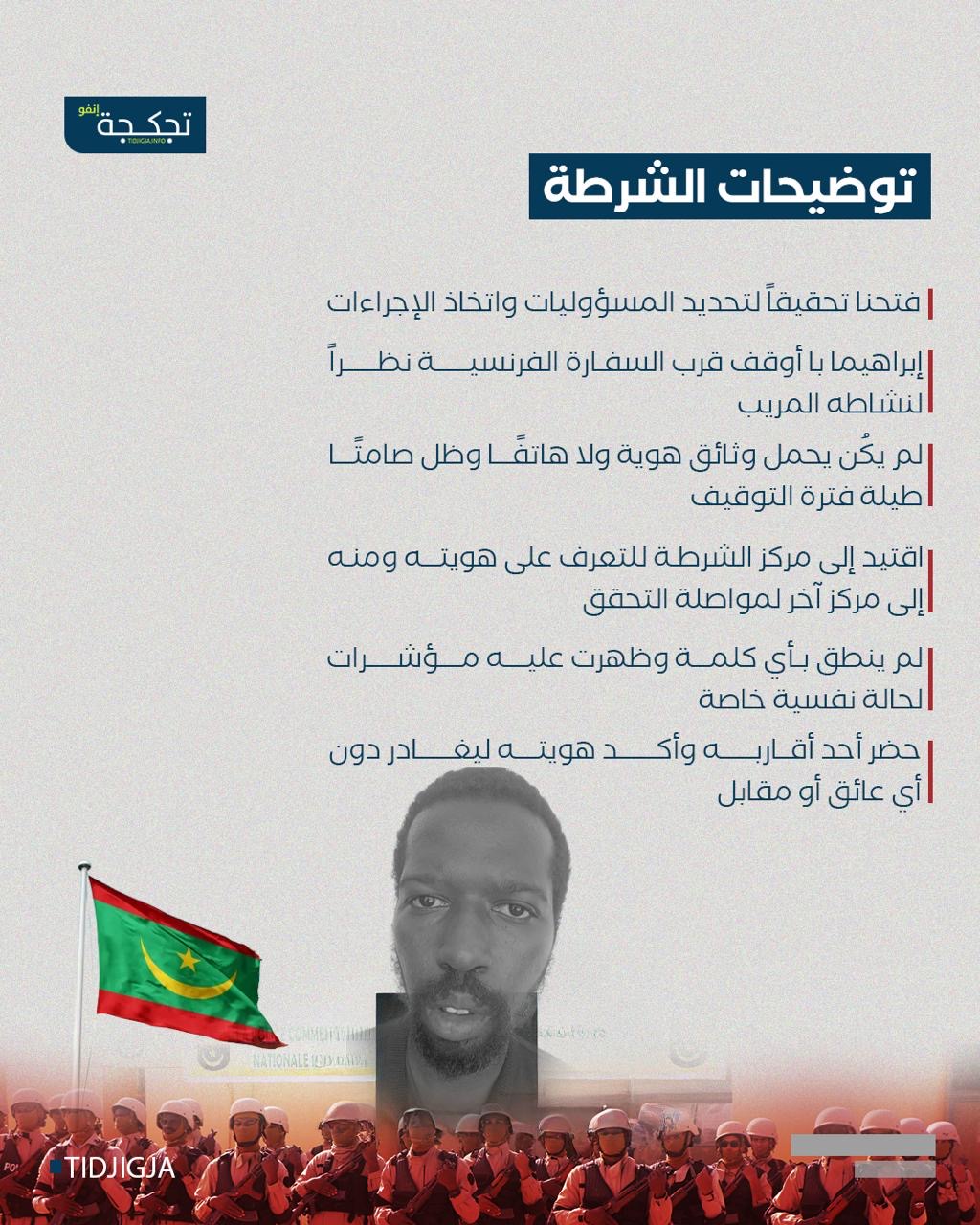وأوضحت الشرطة أن إبراهيما با تم توقيفه قرب مبنى السفارة الفرنسية بعد رصد نشاط وصفته بالمريب، حيث لم يكن يحمل أي وثائق هوية أو هاتف، كما ظل صامتًا طيلة فترة التوقيف.