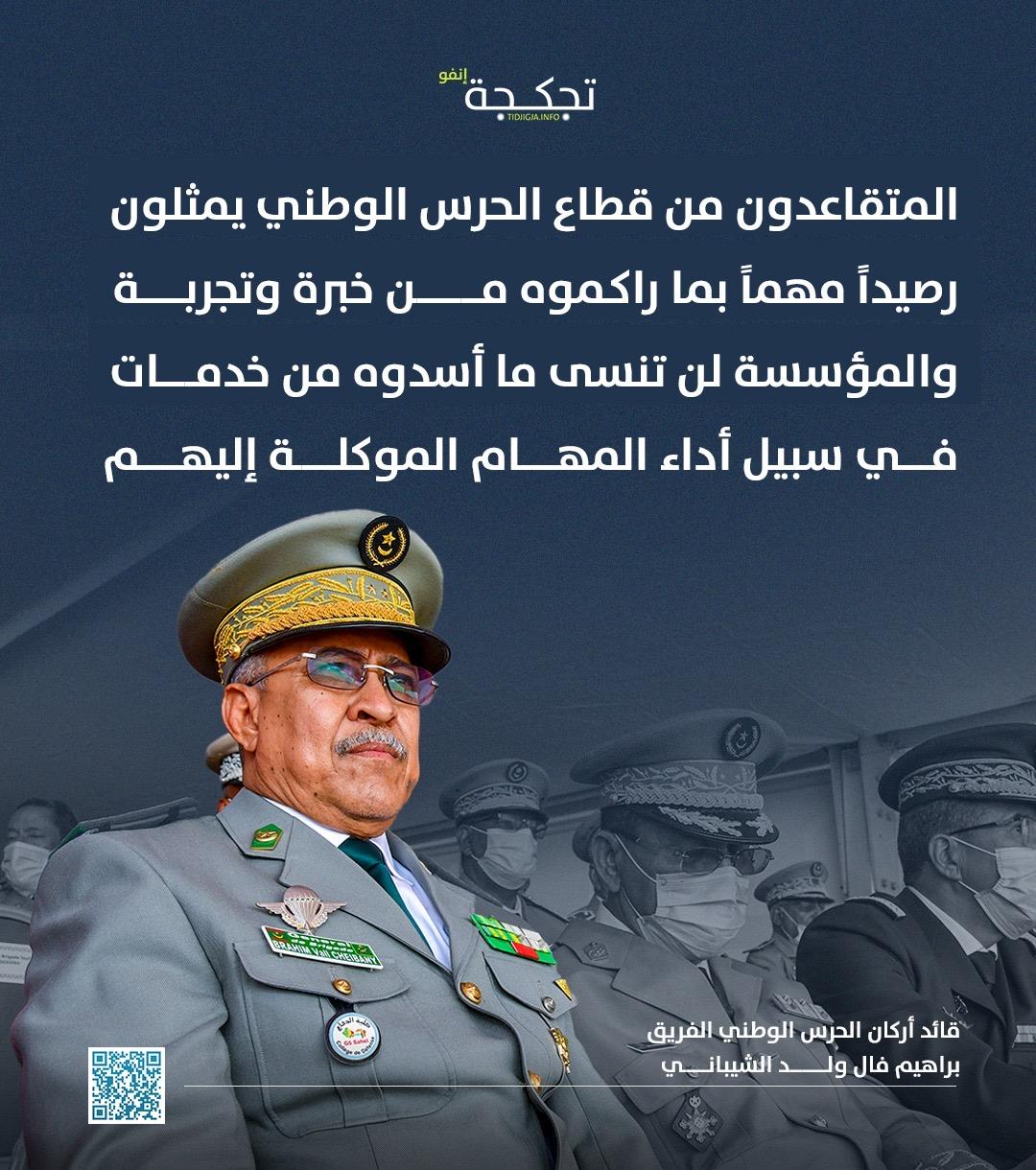 قال قائد أركان الحرس الوطني الفريق إبراهيم فال ولد الشيباني إن المتقاعدين من قطاع الحرس الوطني يمثلون رصيداً مهماً بما راكموه من خبرة وتجربة.