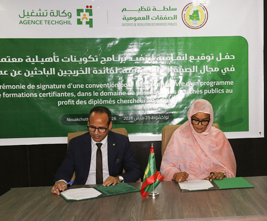 وقّعت سلطة تنظيم الصفقات العمومية زوال اليوم الأربعاء في نواكشوط، اتفاقية شراكة مع الوكالة الوطنية للتشغيل، تهدف إلى تنفيذ برنامج تكوين وتأهيل في مجال الصفقات العمومية لصالح الخريجين الباحثين عن عمل.