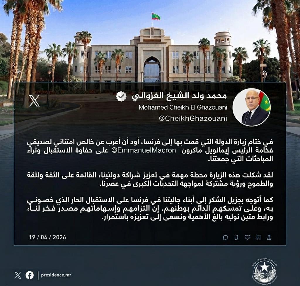 كما توجه رئيس الجمهورية بجزيل الشكر إلى أفراد الجالية الموريتانية المقيمة في فرنسا، مشيدا بحفاوة الاستقبال الذي خصوه به، ومؤكدا أن تمسكهم بوطنهم وإسهاماتهم يمثلان مصدر فخر، ورابطا متينا تحرص الدولة على تعزيزه بشكل مستمر.