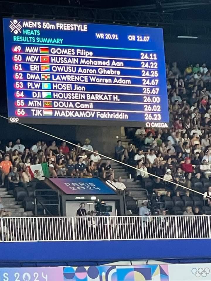 أنهى السباح الموريتاني كامل ولد الدو مشاركته في منافسات السباحة في مسافة 50 متر سباحة حرة، في إطار أولمبياد باريس في المركز الـ55 من أصل 73 متسابق.