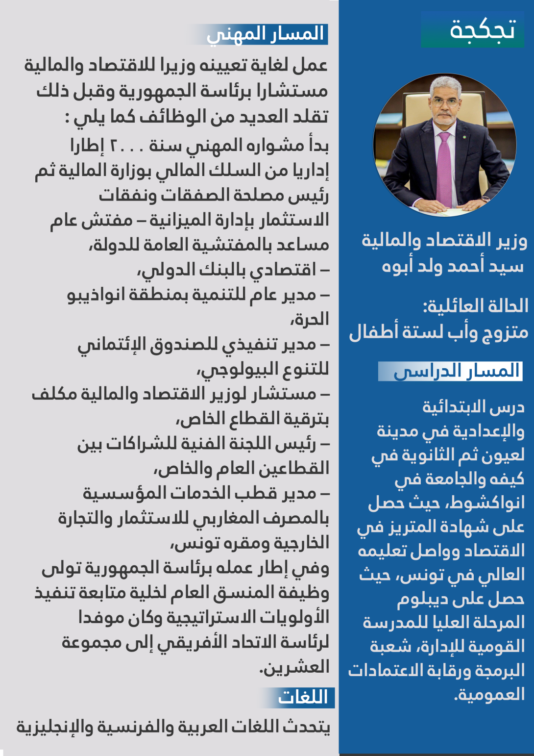 Aug 08 / التعليقات الوزير سيد أحمد ولد أبوه.. مسار مهني حافل يتوجه بوزارة الاقتصاد.والمالية (انفوغراف) خميس, 2024/08/08 - 22:45