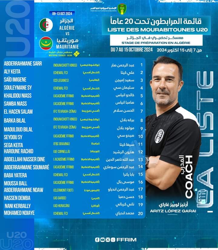 أعلن مدرب المنتخب الوطني تحت 20 عاما أرتيز لوبيز غـاراي، قائمته التي ستخوض معسكرا تحضيريا في الجزائر، في الفترة من 7 إلى 15 أكتوبر.