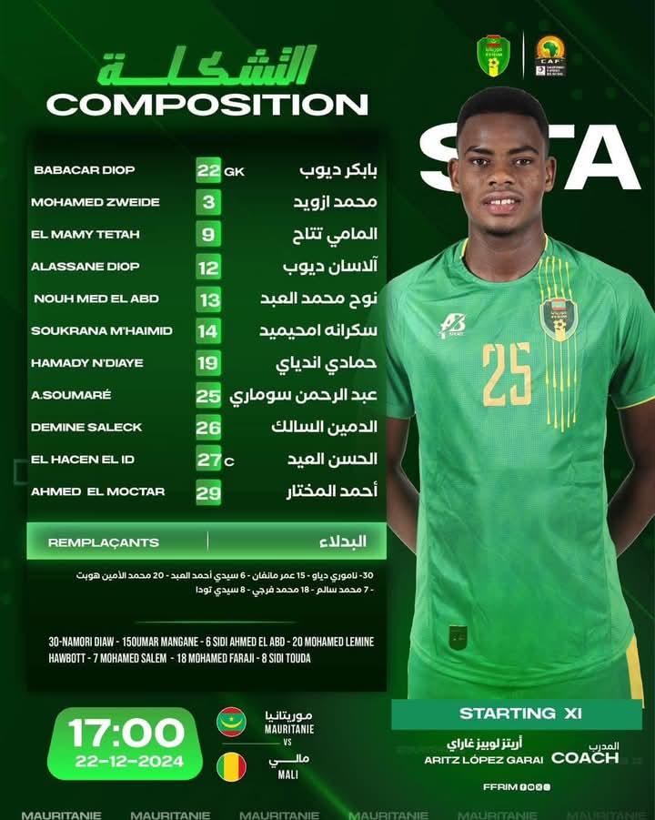 Dec 22 / التعليقات مدرب المنتخب الوطني للمحليين يكشف تشكيلة الفريق لمواجهة مالي أعلن مدرب المنتخب الوطني للمحليين آريتز لوبيز غاراي التشكيلة المستدعاة لمواجهة مالي. وتنطلق المباراة عند الساعة الخامسة بتوقيت غرينتش، وستكون منقولة على قناة "الموريتانية الرياضية". يمكنكم الاطلاع على التشكيلة في التصميم المرفق. أحد, 2024/12/22 - 16:35