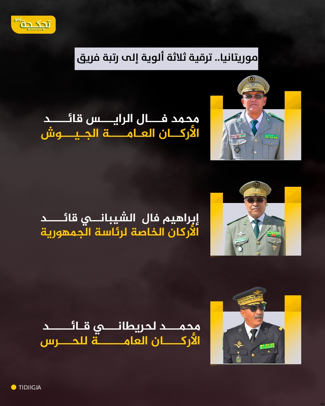 Mar 12 / التعليقات ترقية ثلاثة جنرالات في الجيش الوطني إلى رتبة فريق (انفوغراف) نال ثلاثة ألوية في الجيش الوطني، اليوم الأربعاء، الترقية إلى رتبة فريق.يتعلق الأمر بكل من:محمد فال ولد الرايس قائد الأركان العامة الجيوشإبراهيم فال ولد الشيباني قائد الأركان الخاصة لرئاسة الجمهوريةمحمد لحريطاني قائد الأركان العامة للحرس أربعاء, 2025/03/12 - 18:22