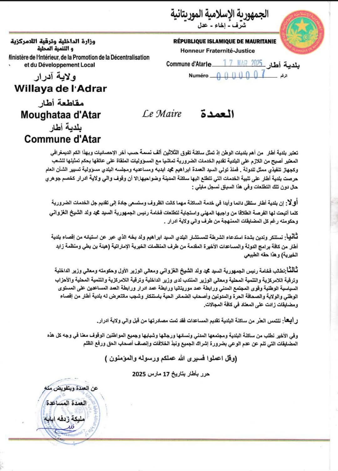 أصدرت بلدية أطار بيانا شديد اللهجة، قالت فيه إنها تتعرض لمضايقات من والي الولاية زادت على المعتاد في كافة المجالات .. كما اتهمته بأنه حال دون تحقيقها لتطلعات الساكنة، ودعت الرئيس محمد ولد الغزواني، والحكومة للتدخل.