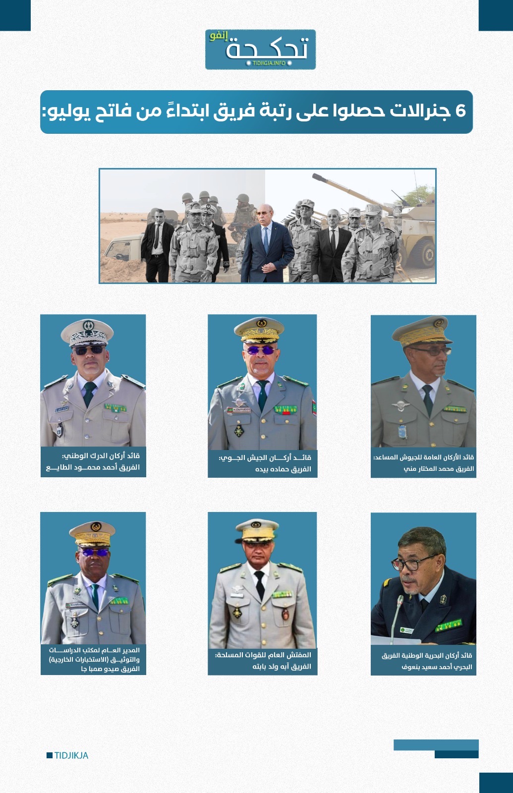 دخلت ترقية ستة جنرالات موريتانيين إلى رتبة فريق حيز التطبيق ابتداءً من يوم أمس الثلاثاء (01 يوليو).