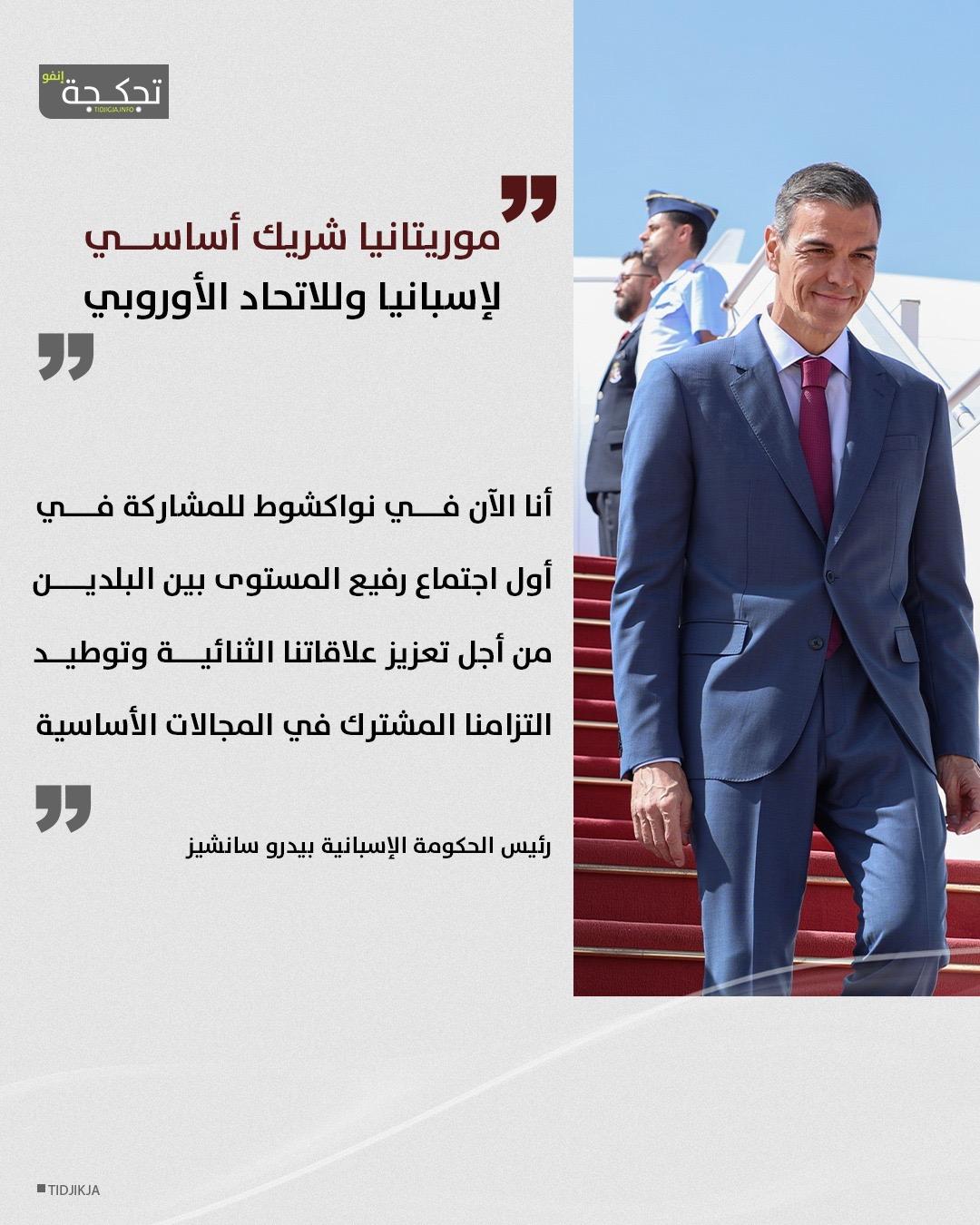 ووصل رئيس الحكومة الإسبانية نواكشوط في مستهل زيارة رسمية لموريتانيا، سيجري خلالها جملة من اللقاءات الثنائية، مع مسؤولين موريتانيين بينهم الرئيس محمد ولد الشيخ الغزواني.