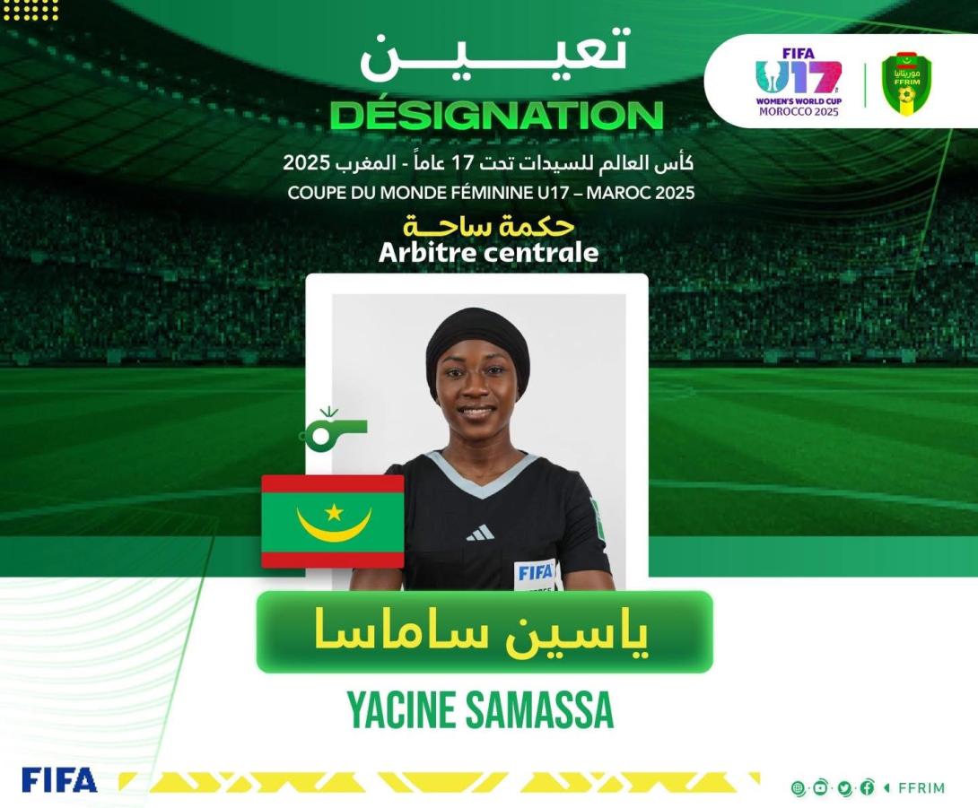 عين الاتحاد الدولي لكرة القدم "فيفا" حكمة الساحة الموريتانية ياسين ساماسا، ضمن طاقم تحكيم كأس العالم للسيدات تحت 17 عاماً.