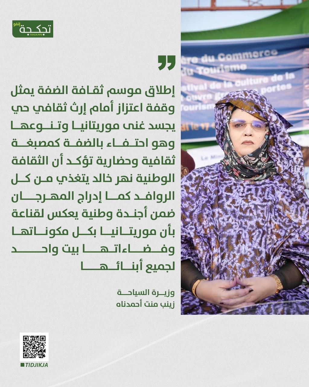 قالت وزيرة التجارة والسياحة، زينب بنت أحمدناه، إن إطلاق موسم ثقافة الضفة يمثل وقفة اعتزاز أمام إرث ثقافي حي يجسد غنى موريتانيا وتنوعها.