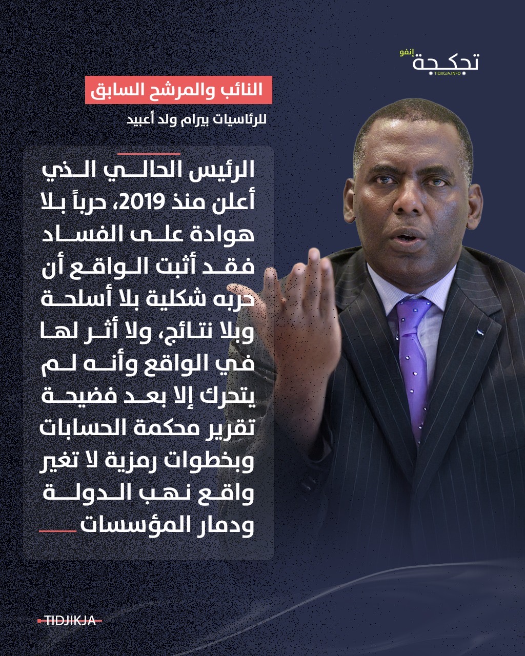 ،وأضاف ولد اعبيد أن الرئيس "لم يتحرك إلا بعد فضيحة تقرير محكمة الحسابات، وبخطوات رمزية لا تغير واقع نهب الدولة ودمار المؤسسات".