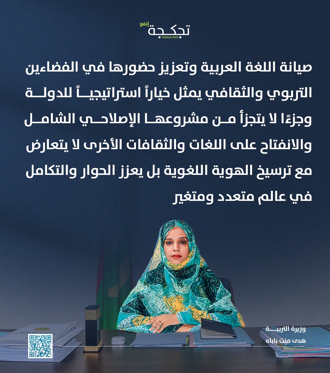 وجاءت تصريحات الوزيرة خلال افتتاح الورشة العلمية المتخصصة رفيعة المستوى بعنوان: «لغة الضاد في سياق الهجرات والهوية العربية في موريتانيا والعالم»، المنظمة من طرف المنظمة العربية للتربية والثقافة والعلوم (الألكسو)، بالتعاون مع اللجنة الوطنية الموريتانية للتربية والثقافة والعلوم، اليوم الاثنين.