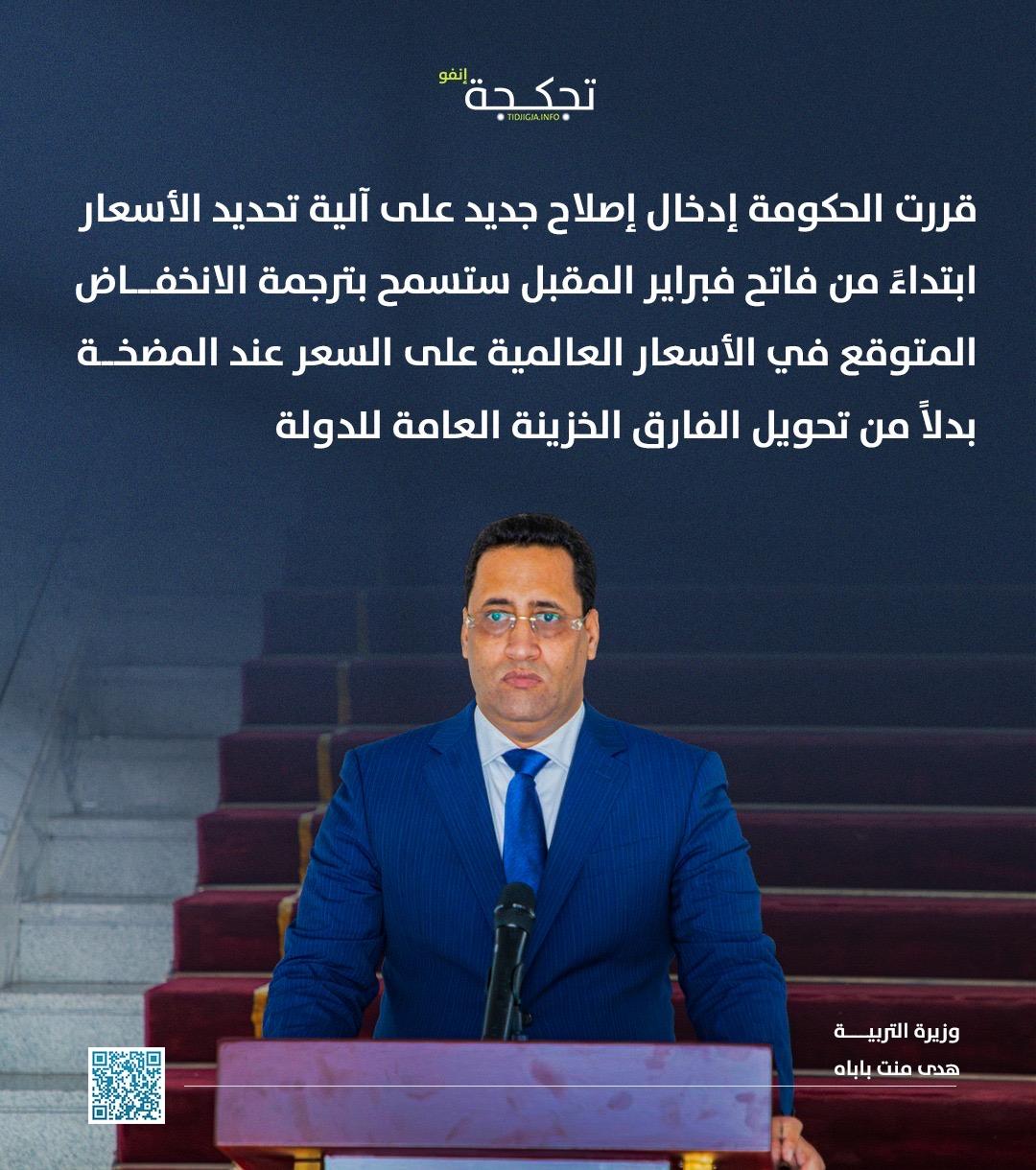 قال الوزير الأول المختار ولد أجاي إن الحكومة قررت إدخال إصلاح جديد على آلية تحديد أسعار المحروقات، ابتداءً من فاتح فبراير المقبل، يهدف إلى تمكين المواطنين من الاستفادة المباشرة من الانخفاض المتوقع في الأسعار العالمية، من خلال عكسه على السعر عند المضخة، بدلاً من تحويل الفارق إلى الخزينة العامة للدولة.