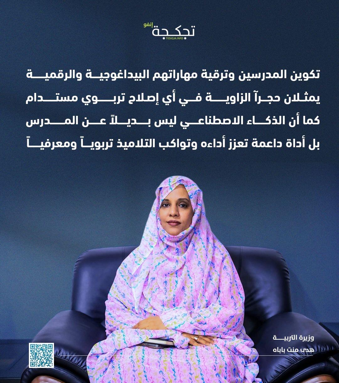 قالت وزيرة التربية هدى منت باباه إن تكوين المدرسين والارتقاء بمهاراتهم البيداغوجية والرقمية يشكلان حجر الزاوية في الإصلاح التربوي المستدام.