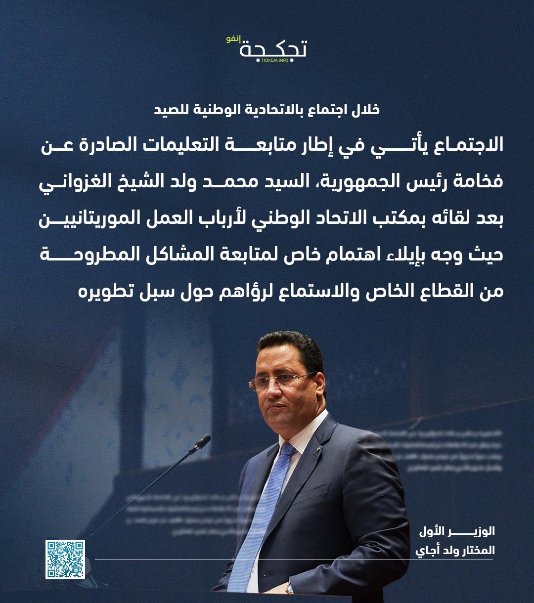 أكد الوزير الأول المختار ولد أجاي، أن اجتماع الحكومة مع الاتحادية الوطنية للصيد يندرج في إطار تنفيذ التعليمات السامية لرئيس الجمهورية محمد ولد الشيخ الغزواني، الرامية إلى تعزيز التشاور مع القطاع الخاص ومواكبة انشغالاته.