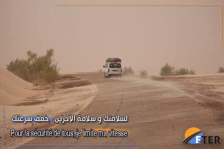 نبهت مؤسسة أشغال صيانة الطرق (ETER) إلى أن بعض المناطق شمالي البلاد، تشهد نشاطا ملحوظا للعواصف الرملية المصحوبة برياح قوية، مما يؤدي إلى تدن كبير في مدى الرؤية وصعوبة في التنقل.