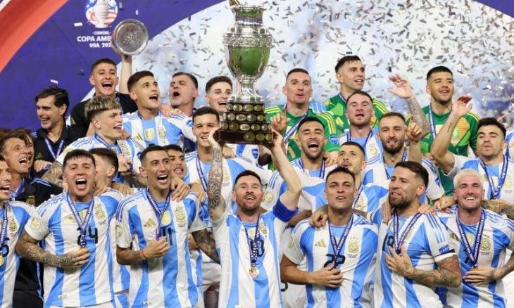 وفازت الأرجنتين على كولومبيا بهدف دون رد في الدقيقة 112 من زمن المباراة النهائية لكوبا أمريكا التي استضافتها الولايات المتحدة، ليقود ميسي بلاده لثالث لقب على التوالي، عقب الفوز بكوبا أمريكا الماضية 2021 ثم كأس العالم 2022 بقطر.