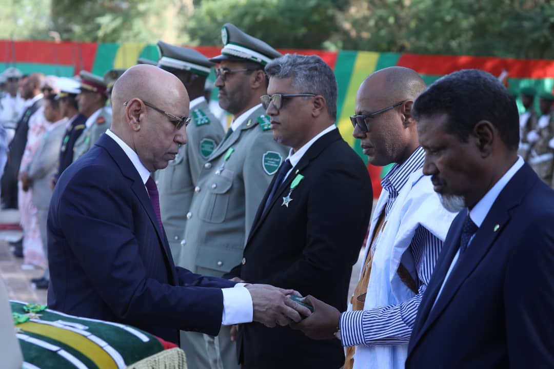 وشح الرئيس محمد ولد الشيخ الغزواني، الخميس، الإداري المدني الحاكم الراحل جاكيلي ولد المختار بوسام فارس فى نظام الاستحقاق الوطني.