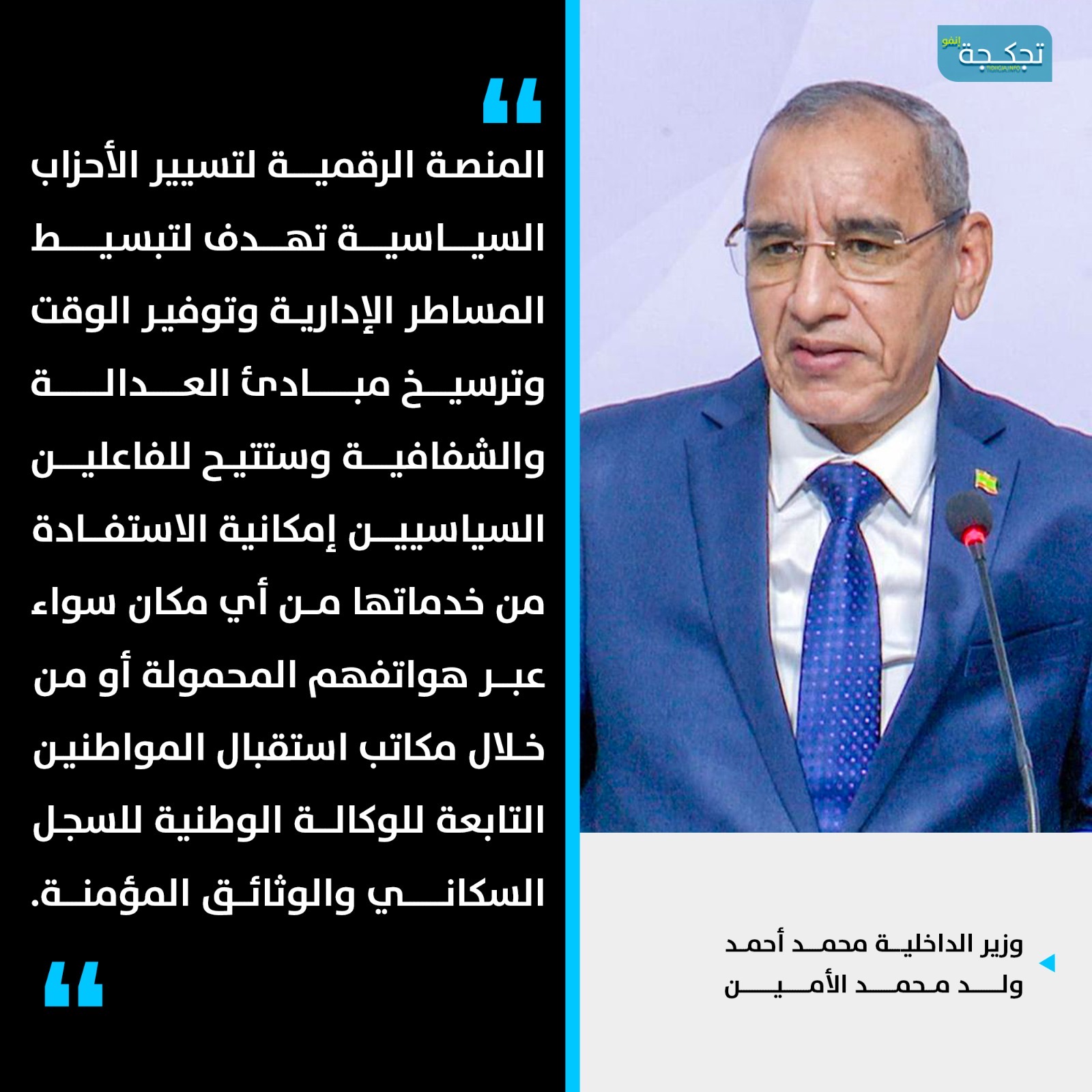 قال وزير الداخلية محمد أحمد ولد محمد الأمين إن منصة تسيير الأحزاب السياسية تأتي تتويجًا لجهود الحكومة الرامية إلى تعزيز الديمقراطية، وتحديث الإدارة، ورقمنتها،بما يساهم في تسهيل الإجراءات وتقريب الإدارة من المواطن.