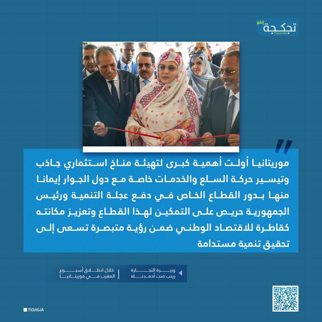 وأكدت الوزيرة خلال انطلاق "أسبوع المغرب في موريتانيا"، أن الرئيس محمد ولد الشيخ الغزواني حريص على التمكين لهذا القطاع وتعزيز مكانته كقاطرة للاقتصاد الوطني، ضمن رؤية متبصرة تسعى إلى تحقيق تنمية مستدامة.