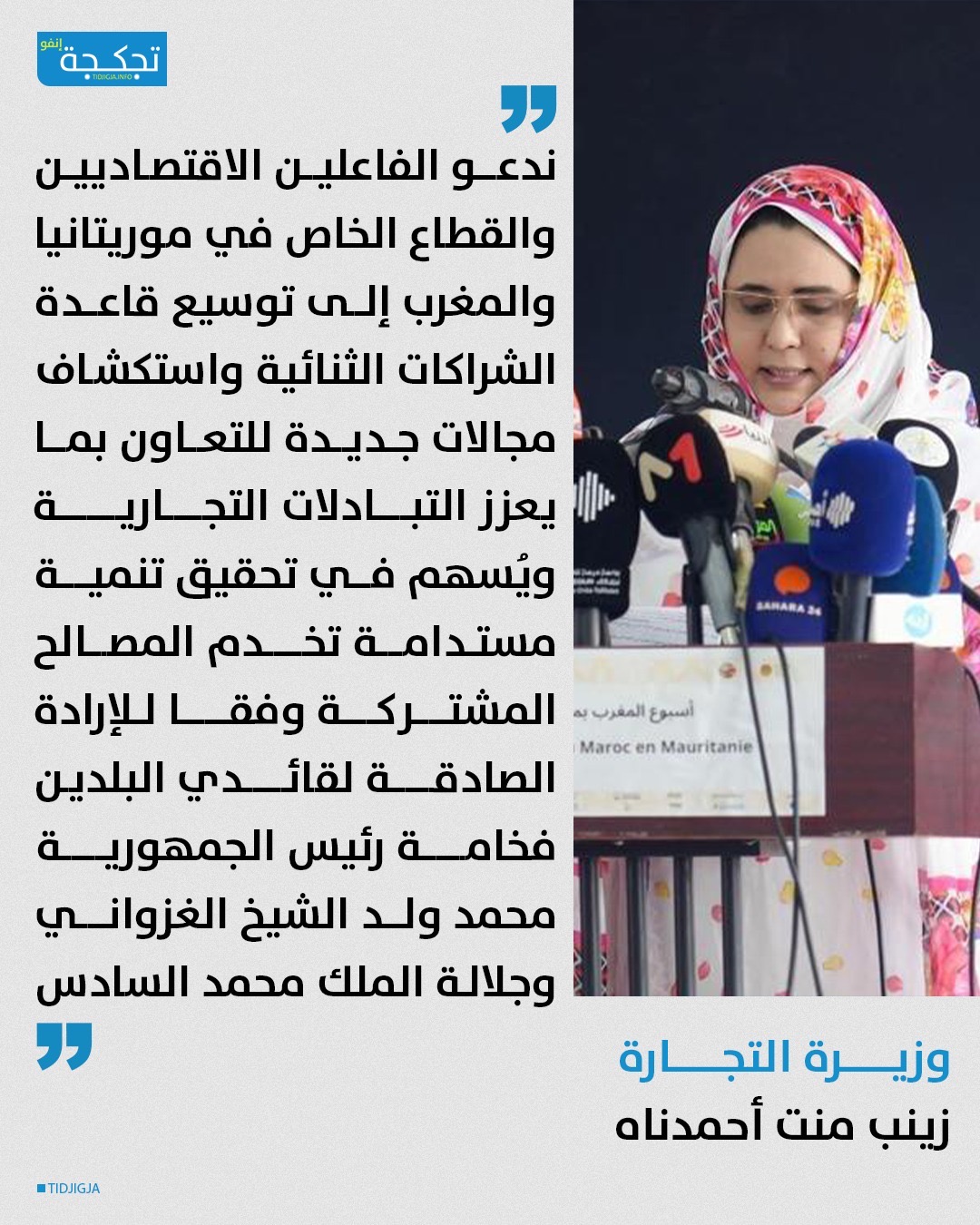 وأضافت الوزيرة أن ما يجمع بين موريتانيا والمغرب، من وشائج تاريخية وثقافية واجتماعية متينة، يفرض اليوم أكثر من أي وقت مضى، العمل سوياً على تعزيز الشراكة وتكثيف الجهود في مختلف مجالات التعاون، لا سيما في ظل التحديات الاقتصادية والجيوسياسية التي يشهدها العالم.