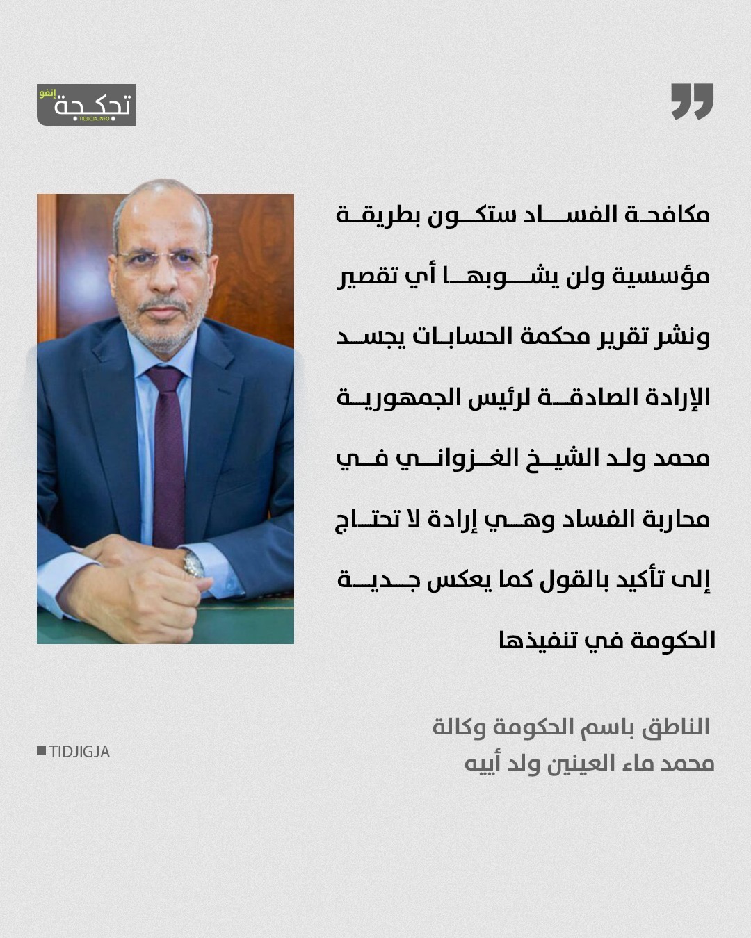 قال الناطق باسم الحكومة وكالة، محمد ماء العينين ولد أييه، إن مكافحة الفساد ستتم بطريقة مؤسسية ولن يشوبها أي تقصير، مؤكداً التزام الحكومة بالجدية في تنفيذ هذه الاستراتيجية.